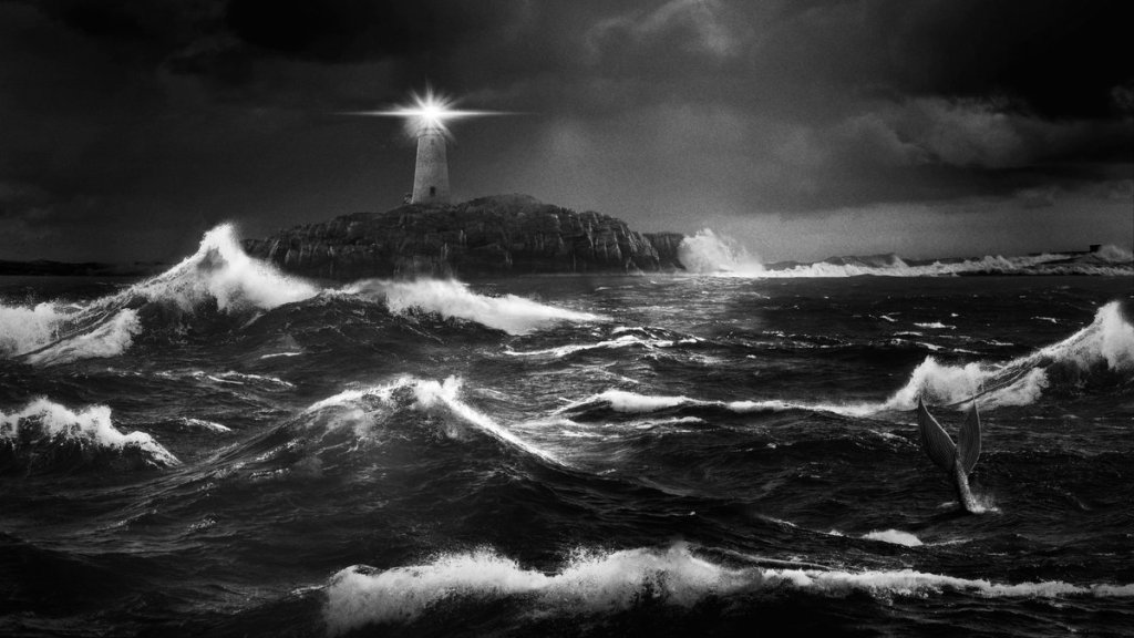 Le premier plan nous offre, dès le début, cette esthétique du cinéma expressionniste allemand utilisée par Eggers tout au long de Lighthouse. Ici, ce sont moins les contrastes de clairs obscurs qui sont à observer, même si présents, mais plutôt le décor. On voit la seule maison de l’île, tout juste située à côté du phare, et au fond une mer qui s’étend à perte de vue. Un plan qui encapsule toute la solitude du film. Ce paysage en noir et blanc donne l’impression d’un rêve, voire d’un cauchemar. Ce plan dérange de par son étrangeté. La maison semble fausse, elle semble dessinée. Les lignes noires qui détourent la maison donnent cette impression de dessin. Cet effet du faux se retrouve dans les films expressionnistes allemands où l’on crée volontairement des décors afin d’instaurer une ambiance étrange. Parfois même ces décors ne sont que des toiles placées sur le fond sur lesquelles les décors sont peints, comme c’est le cas dans Le cabinet du Dr. Caligari (1920, Wiene). La maison, selon moi, donne ce sentiment. Elle semble dessinée et détachée du reste à la manière d’une peinture ou encore d’un décor de théâtre. Cette interprétation est d’autant plus pertinente lorsque l’on sait que Robert Eggers a fait entièrement construire le décor pour le film.