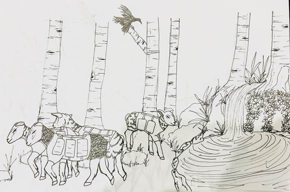 Après quelques minutes, il entend une source d’eau au loin. Tant mieux, il a soif. Il s’avance en direction de ce son, puis s’arrête quand il y arrive. Devant lui, il y a un troupeau de moutons. Les moutons se penchent au-dessus de la source, récoltent l’eau et la transportent dans des sacs sur leur dos. Ils doivent probablement les apporter à un puits afin de fournir leur peuple en eau. Tel est leur travail, semble-t-il.