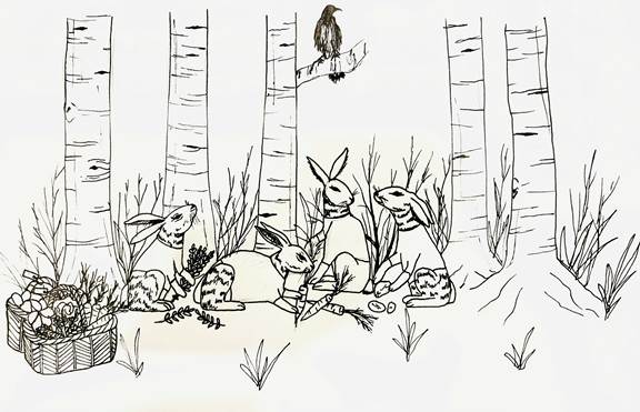 Des lapins qui parlent… mais pas seulement. Des lapins qui travaillent. Ils ont l’air de trier leurs légumes, d’en faire des paniers, d’y accrocher un prix, bref une activité de citoyens marchands. Leur marché doit être proche.